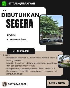 Dalam rangka peningkatan mutu akademik dan pengembangan institusi, STIT Al-Quraniyah Manna membuka kesempatan bagi akademisi terbaik untuk bergabung sebagai Dosen Program Studi Pendidikan Agama Islam (PAI).